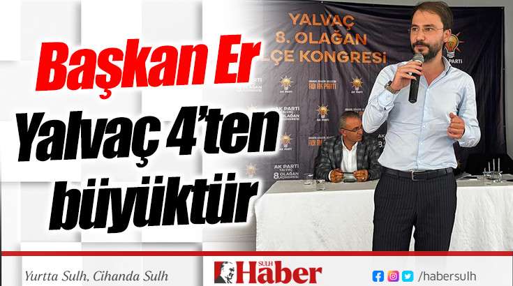 Başkan Er, açıklamasında; “Gerek manevi olarak gerek hükümet hizmetleri olarak, yatırımlar olarak en büyük desteğini alacağına inanıyorum. Sayın Cumhurbaşkanı’mız Recep Tayyip Erdoğan, bu güzide ilçemizde ilk defa böyle bir kongre, birlik beraberlik içerisinde bir kongre geçirdiğimiz için de ayrıca memnun olacağına inanıyorum. İnşallah büyük kongrede de aynı şekilde bu birliği ve beraberliği sağlarız diyorum. Son olarak şunu da Yalvaç’a bir slogan olarak bırakmak istiyorum. Bundan sonra Yalvaç’taki birliğimizin beraberliğimizin bozulmayacağına inanıyorum. Yalvaç 4’ten büyüktür diyorum” ifadelerinde bulundu.