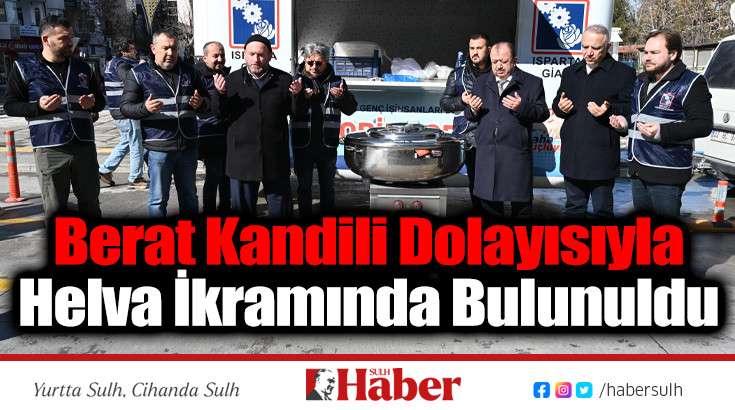 Ramazan-ı Şerif'in müjdecisi, Allah'ın rahmetinin yeri ve göğü kapladığı af, merhamet ve mağfiret vesilesi olarak kabul edilen mübarek Berat Kandili idrak ediliyor. Berat Kandili dolayısıyla Isparta Genç İş İnsanları Derneği Başkanı Süleyman Çağrı Çiftçi ve dernek üyeleri tarafından belediye hizmet binası önünde vatandaşlara helva ikramında bulunuldu. Yapılan duanın ardından Isparta Belediye Başkan Yardımcısı Musa Macit ve Isparta Genç İş İnsanları Derneği Başkanı Süleyman Çağrı Çiftçi vatandaşlara helva ikram etti.