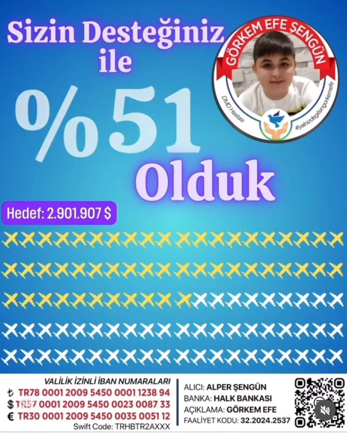Isparta’da yaşayan ve Duchenne Musküler Distrofi (DMD) hastalığıyla mücadele eden küçük Görkem Efe Şengün’ün yurt dışında uygulanacak tedavisi için başlatılan Valilik Onaylı kampanyada büyük bir aşama kaydedildi. 2 milyon 920 bin dolarlık tedavi masrafının %51’i tamamlanarak umutlar yeniden filizlendi.