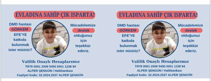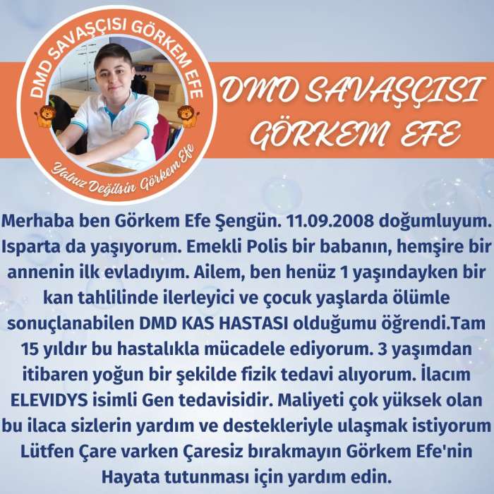 Emekli bir polis babanın ve hemşire bir annenin ilk çocuğu olan Görkem, henüz 1 yaşındayken bu ilerleyici kas hastalığı teşhisi konuldu. Görkem, 3 yaşından bu yana düzenli olarak yoğun fizik tedavi görüyor. Hayata tutunabilmesi için tek umudu ise maliyeti oldukça yüksek olan ELEVIDYS Gen Tedavisi. Ailesi ve sevdikleri, bu tedaviye ulaşabilmek için toplumun yardımını bekliyor. Isparta Valiliği’nin resmi izniyle (32.2004.2537) başlatılan yardım kampanyası, Görkem’in hayallerine ulaşabilmesi için bir fırsat sunuyor. Görkem, destek çağrısını şu sözlerle dile getiriyor: “Lütfen çare varken çaresiz bırakmayın. Hayata tutunmam için yardım edin.” Destek olmak ve Görkem’in mücadelesine ortak olmak için bilgilerinizi güncel kampanya detaylarına göre paylaşabilirsiniz.