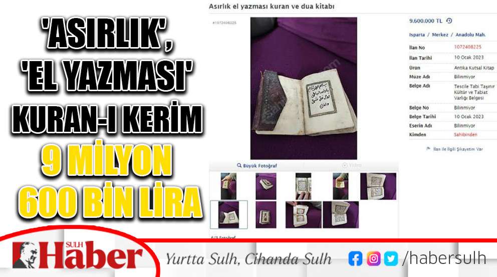 İlan sahibi, Tescile Tabi Taşınır Kültür ve Tabiat Varlığı Belgesi bulunduğunu belirttiği Kur'an-ı Kerim için 9 milyon 600 bin lira fiyat biçti. İlanda ayrıca 'Bir asırdan fazla tarihi var. İçinde dualar ve çeşitli nasihat hikayeler yazılı. Anadolu yazması. Aile yadigarı, Osmanlı zamanından kalma' ifadeleri yer aldı.