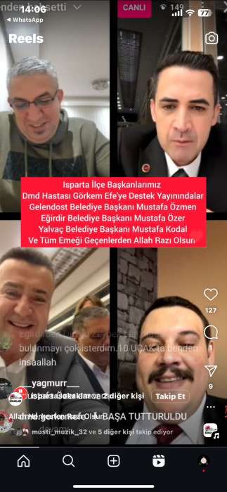 Her akşam Görkem Efe’nin babası Alper Şengün moderatörlüğünde Instagram’daki @dmd.gorkemefe hesabında canlı olarak sürdürülen bağış yayınında dün akşam anlamlı bir buluşma gerçekleşti. Eğirdir Belediye Başkanı Mustafa Özer, Gelendost Belediye Başkanı Mustafa Özmen ve Yalvaç Belediye Başkanı Mustafa Kodal, Eğirdir’deki iftar programının ardından canlı yayına katılarak Görkem Efe’ye umut oldu.