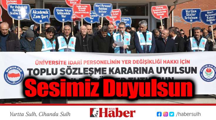 ''Saygıdeğer Basın Mensupları, Değerli Üniversite Personeli ve Kamuoyunun Bilgisine Toplu sözleşme kararı uygulansın, üniversite idari personeline yer değişikliği hakkı tanınsın 657 sayılı Devlet Memurları Kanunu’na tabi olarak istihdam edilen üniversite idari personeli, kadro ve pozisyon unvanları itibarıyla her üniversitede aynı yeterliliğe sahip olup aynı işi yapmaktadır. Ancak bakanlık ve taşra teşkilatı bulunan diğer merkezi kamu kurum ve kuruluşlarında çalışan idari personel gibi iller veya kurumlar arası merkezî yer değişikliği hakkına sahip değildir (A-i-le bir-li-ği sağ-lan-ma-lı-dır).