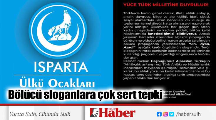 Kadın cinayetleri ve kadına şiddeti protesto ettikleri gerekçesiyle, bazı gösterilerde, terör örgütüne ait kelimelerle slogan atanlara Ülkü Ocakları Isparta İl Başkanlığı Üniversite birimi çok sert tepki gösterdi. Süleyman Demirel Üniversitesi Ülkücüleri imzalı açıklamada şunlar kaydedildi;