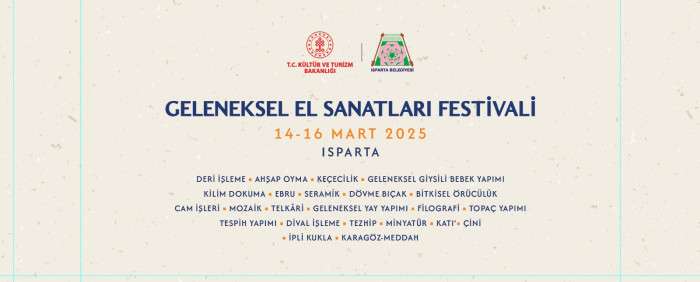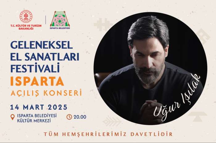 Kültür ve Turizm Bakanlığı ile Isparta Belediyesi iş birliği içinde Isparta Geleneksel El Sanatları Festivali 14-16 Mart 2025 tarihleri arasında gerçekleştirilecek. Festivalin ilk gününde Uğur Işılak konser verecek. 3 gün sürecek festival Isparta Belediyesi Kültür Merkezinde gerçekleştirilecek.