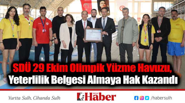 Süleyman Demirel Üniversitesi 29 Ekim Olimpik Yüzme Havuzu, Türkiye Yüzme Federasyonu tarafından onaylanan “Yeterlilik Belgesi”ni almaya hak kazandı. 29 Ekim Olimpik Yüzme Havuzunda düzenlenen törende Isparta Gençlik ve Spor İl Müdürü Murat Çağrı Kaya tarafından takdim edilen belgeyi, SDÜ Rektörü Prof. Dr. Mehmet Saltan teslim aldı.