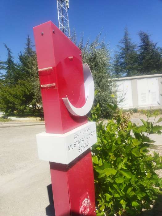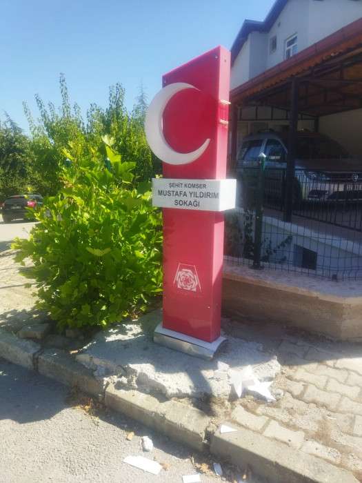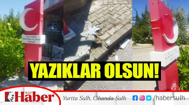 Işıkkent Mahallesi’nde bulunan Şehit Komiser Mustafa Yıldırım Sokağı’nın tabelası da kimliği tespit edilemeyen kişi ya da kişilerce saldırıya uğradı. Ay yıldızlı tabelanın yıldızı kırılarak yerlere saçıldı.